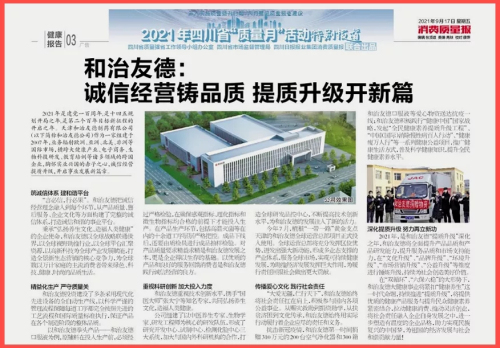 今年9月是第44个全国“质量月”。9月17日,《消费质量报》以《和治友德:诚信经营铸品质 提质升级开新篇》为题,宣传天津和治友德制药有限公司胸怀实业兴国的赤子之心,打造诚信体系铸就和谐平台、传播爱心文化践行社会责任、积极响应号召支援抗疫一线、健康提质升级助力健康中国,为中国健康产业的发展,为经济发展与社会和谐贡献力量。