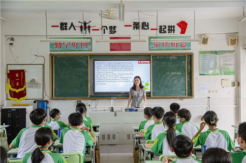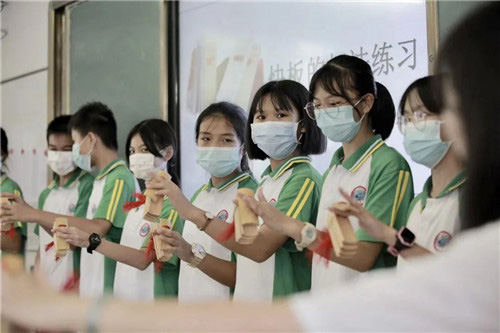 广州新时代少年快板先锋队总训师、青年快板表演艺术家张世源给学生们带来了快板,手把手地教学生们用快板去表演古诗词;