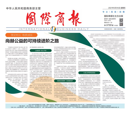 9月16日,中华人民共和国商务部主管《国际商报》以《坚定初心 收获成长——尚赫公益的可持续进阶之路》为题,从“公益助学”“聚焦体育精神”“公益让梦想照进现实”三个方面,报道尚赫多年来诚信、稳健、踏实开展公益事业,不断创造差异性公益举措,可持续进阶的公益之路。