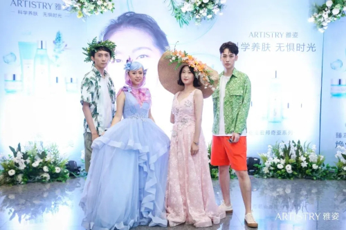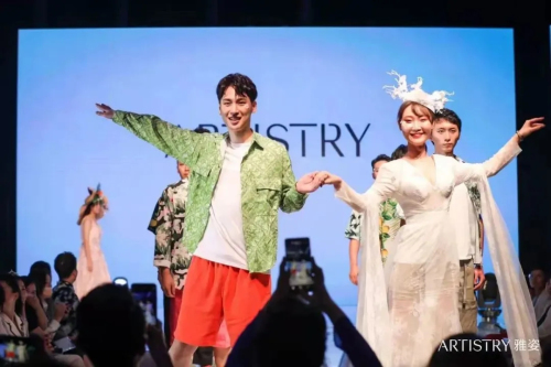 模特们仿佛从森林走出的小精灵,手持“宏邦奇亚”的一系列新品,迈着轻盈的步伐,为观众缓缓展开雅姿3.0“宏邦奇亚”系列的美肤画卷。