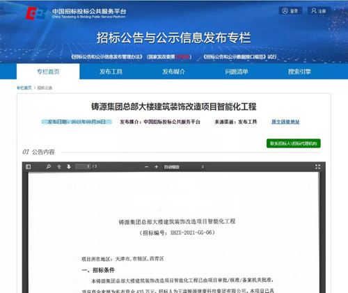 2021年9月30日上午,铸源集团总部大楼装修改造工程项目的消防、给排水、空调三项招标工作进行现场评标、开标。此次评审工作是从天津市专家库中随机抽取五位专家进行综合评定,铸源集团副董事长兼总裁许强、行政副总裁曹文刚出席评审会议。项目智能化工程和装修结构改造工程也已在招标公示中。