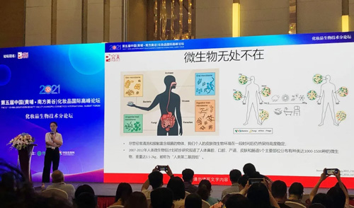 完美公司研发中心日化研发部贺晓静总监带来《皮肤微生态在化妆品领域的研究进展》分享,向大家介绍“从肠道微生态到皮肤微生态的关系”和“皮肤上的微生物种类和作用”,告诉大家化妆品在皮肤上起的作用。贺晓静表示,烟酰胺、神经酰胺、VC及其衍生物、视黄醇类等直接功效成分,以及低聚果糖、多糖、微生物发酵成分等微生态调节成分共同构成了微生态护肤品,这就是微生态产品开发思路,而微生态则是完美四大科研领域之一。目前,完美公司建有微生态研究中心,并成立了占地1.5万平方米、拥有400多台国际先进的仪器设备的完美生科院,助力完美的微生态研究。
