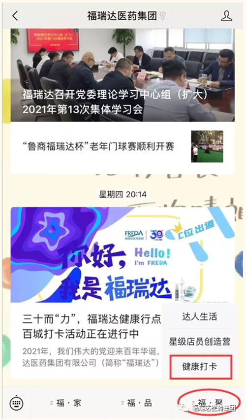 具体信息可通过关注福瑞达医药集团微信公众号,点击底部菜单栏“福·聚”中的“健康打卡”了解详情。