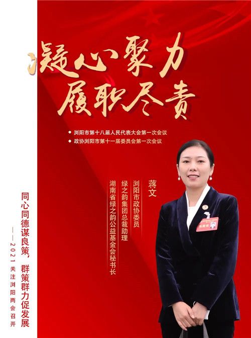 10月21日,浏阳市政协委员、绿之韵集团总裁助理、湖南省绿之韵公益基金会秘书长蒋文与其他委员一同列席了十八届人大一次会议,听取了中共浏阳市委副书记、市人民政府代理市长王雄文作政府工作报告。