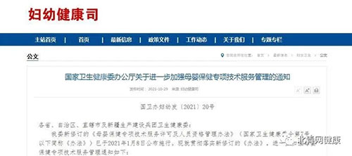 国家卫健委新修订的《母婴保健专项技术服务许可及人员资格管理办法》已于2021年1月8日公布施行。