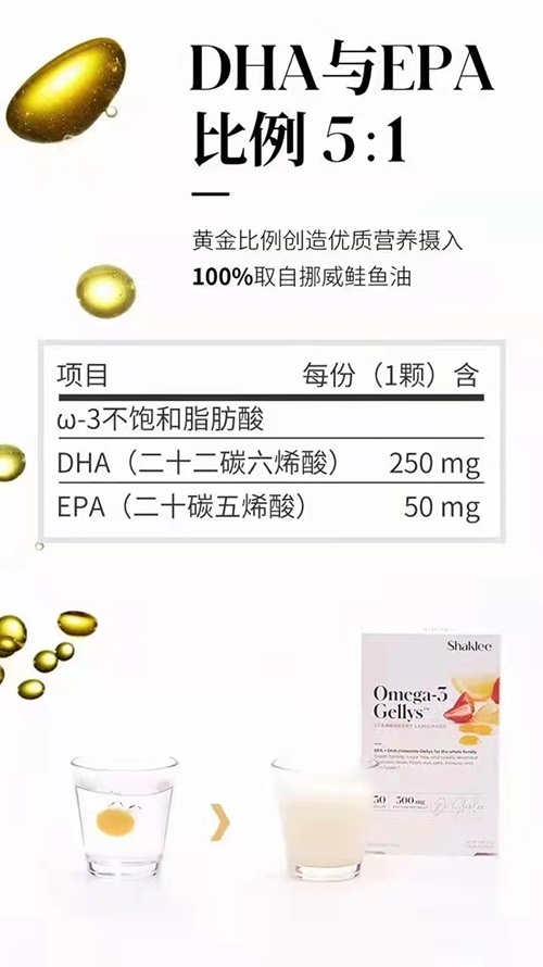 2.有效成分含量高,单粒1.6克重的软糖,内含250毫克DHA+50毫克EPA,含量高于同类产品;