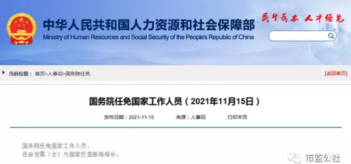 任命甘霖(女)为国家反垄断局局长。
