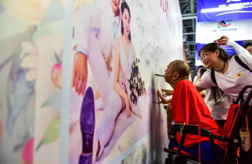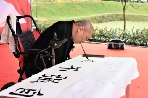 周国民坐着轮椅外出参加爱心活动和书法表演