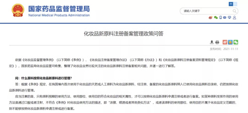 2021年11月11日,国家药监局化妆品监管司收集、整理了化妆品业界比较关注的化妆品新原料注册备案相关问题,发布了《化妆品新原料注册备案管理政策问答》,对化妆品新原料备案中遇到的问题逐一进行了解答。