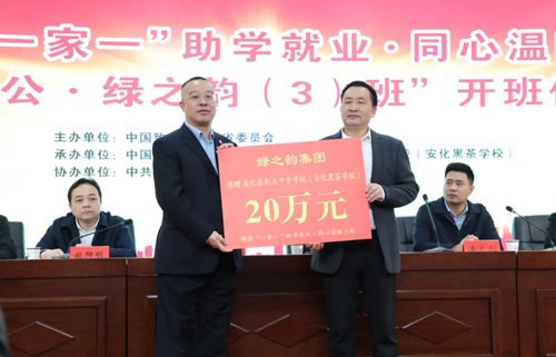 开班仪式上,安化县教育局党组成员、副局长刘胜辉致欢迎辞,致公党湖南省委会副主委谢资清为安化县职业中专学校(安化县黑茶学校)授“致公助学基地”牌匾,致公党长沙市委会秘书长兼办公室主任欧阳明为“致公·绿之韵3班”授牌;湖南省政协委员、致公党湖南省委会互联网+专委会名誉主任、绿之韵集团董事长胡国安向安化县职业中专学校(安化县黑茶学校)捐赠20万元,用于“致公·绿之韵3班”建设和专业人才培养。