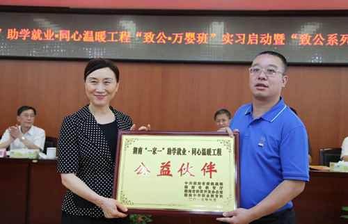 2015年6月26日,湖南省政协主席李微微向胡国安董事长颁发湖南“一家一”助学就业·同心温暖工程公益伙伴牌匾。