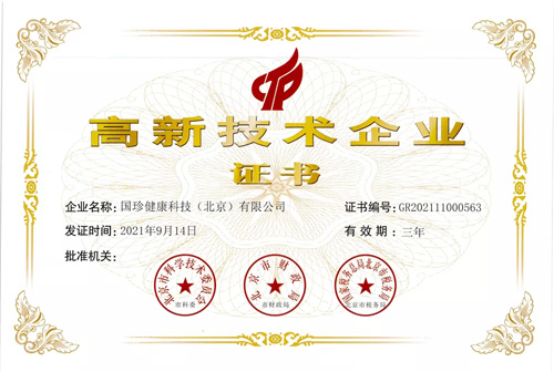 2021年9月,公司旗下国珍健康科技(北京)有限公司获得国家“高新技术企业”证书,该证书由北京市科学技术委员会、北京市财政局、国家税务总局北京市税务局联合颁发。