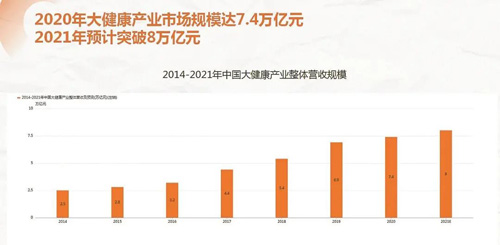 国家卫生健康委官方网站发布的全国健康素养监测结果显示,全国居民健康素养水平逐年上升,与2015年相比,2020年国人健康意识上升了一倍。意识带动需求,需求带动购买力,与此对应的是,中国大健康产业整体营收规模持续上升,2020年市场规模达7.4万亿元,2021年预计突破8万亿元。