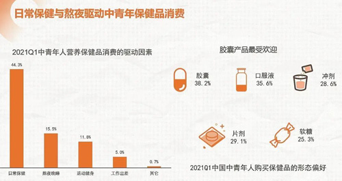 中青年人喜欢为哪方面的营养保健品买单?报告显示,"日常保健"与"熬夜"是驱动中青年保健品消费的首二因素,其次是为运动健身、工作出差。服用、携带便利是中青年人购买保健品的形态偏好,因此胶囊产品最受欢迎,其次是口服液、冲剂、片剂、软糖。
