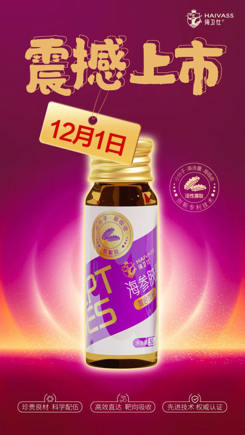 海卫仕海参胶原蛋白肽复合饮品,双肽(北极海参寡肽、鳕鱼胶原蛋白肽)加乘,加倍焕能;复合配方,多效协同;临床前验证,效果真实。12月1日,即将震撼上市!锁定绿厨小铺小程序,11月12日-12月31日,新品预售有福利!