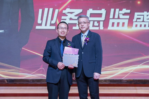 在现场嘉宾、分公司行政员工和业务伙伴的祝福声中,新晋升业务总监王松先生登上了专属于他的荣耀舞台,黄宇明先生为王松先生佩戴荣誉胸章、颁发证书。