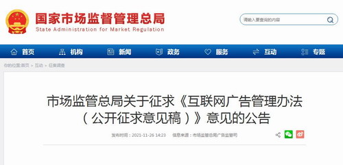 为进一步完善互联网广告监管制度,增强互联网广告监管的科学性、有效性,促进互联网广告业持续健康发展,根据《中华人民共和国广告法》等法律,市场监管总局在修订《互联网广告管理暂行办法》的基础上,起草了《互联网广告管理办法(公开征求意见稿)》,现向社会公开征求意见。欢迎广大公众提出意见,并通过以下途径和方式于2021年12月25日前提出意见: