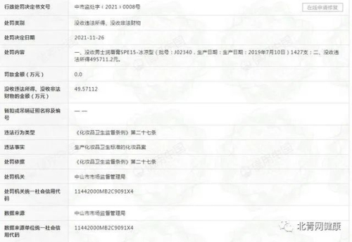 行政处罚内容显示,中山市市场监督管理局没收曼秀雷敦(中国)药业有限公司男士润唇膏SPE15-冰凉型(批号:J02340,生产日期:生产日期:2019年7月10日)1427支;没收违法所得495711.2元。原因是该公司违反了《化妆品卫生监督条例》第二十七条。