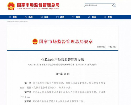 今年8月6日,国家市场监督管理总局发布了《化妆品生产经营监督管理办法》(以下简称《办法》)。这是我国首部专门针对化妆品生产经营管理的部门规章,也是新条例最为重要的配套文件之一,将于2022年1月1日起正式实行。