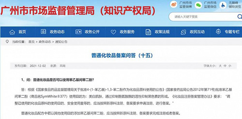 12月2日,广州市市场监督管理局发布《普通化妆品备案问答》,明确指出,“普通化妆品配方中若以其他使用目的添加苯乙基间苯二酚(俗称“377”),应当按照新原料注册、备案要求完成注册或者备案”。
