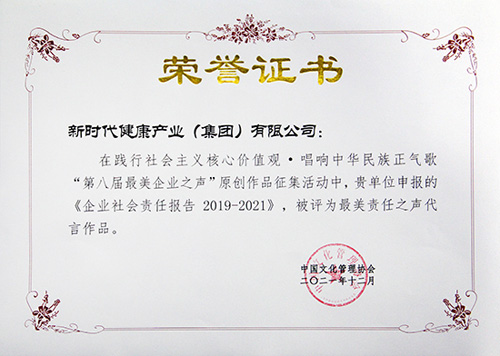 同时,公司《企业社会责任报告2019-2021》作为典型原创文化成果在光明网“最美企业之声”专栏进行展播并荣获“第八届最美企业之声最美责任之声代言作品”,这是公司连续第六年在“最美企业之声”这一面向全国企事业单位的赛事中取得佳绩。