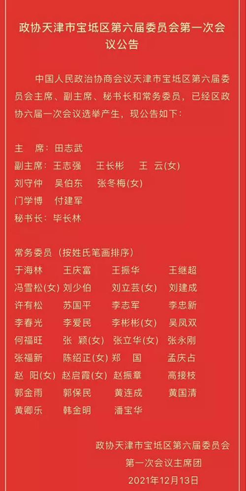 2021年12月13日上午,中国人民政治协商会议天津市宝坻区第六届委员会第一次会议圆满完成各项议程,胜利闭幕。此次会议中,选举产生了新一届区政协主席、副主席、秘书长和常务委员。天津和治友德制药有限公司韩金明董事长当选中国人民政治协商会议天津市宝坻区第六届委员会常务委员,并成为大会主席团成员。