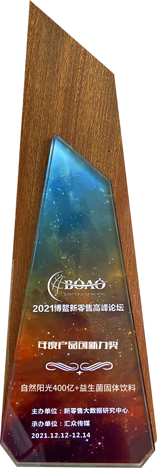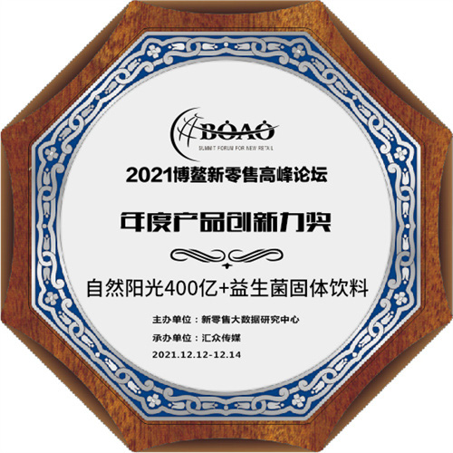 自然阳光400亿+益生菌固体饮料荣获2021博鳌新零售高峰论坛“年度产品创新力奖”。