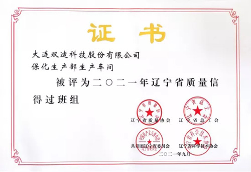 9月,双迪公司保化生产部生产车间荣获辽宁省质量协会、辽宁省总工会、共青团辽宁省委员会、辽宁省科学技术协会联合颁发的“二0二一年辽宁省质量信得过班组”荣誉称号。