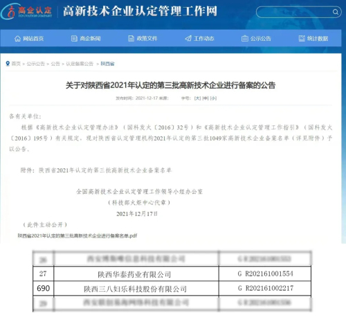 12月17日,全国高新技术企业认定管理工作领导小组办公室公布了关于陕西省2021年第三批国家高新技术企业备案公告,其中,陕西三八妇乐科技集团旗下的陕西三八妇乐科技股份有限公司和陕西华泰药业有限公司榜上有名,这标志着陕西三八妇乐科技集团在自主知识产权、技术成果转化、研发创新等方面呈现出的卓越发展态势得到了肯定,也是企业发展史上又一里程碑。