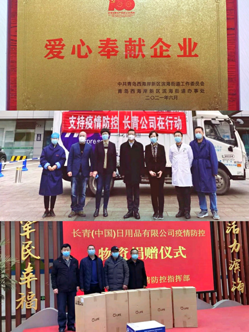 (五)长青中国获“爱心奉献企业” 荣誉 —— 2021年6月,长青中国总部所在的西海岸新区滨海街道办事处举办了中国共产党成立一百周年先进表彰大会和百亿项目签约仪式。多名优秀党员、优秀党务工作者、先进基层党组织以及在疫情防控中有突出贡献的爱心人士和企业获得嘉奖。长青中国在表彰大会上荣获了“爱心奉献企业”荣誉。自疫情开始,长青中国一直高度关注抗疫进展,第一时间购买了价值100多万元的口罩等物资捐赠给抗疫一线。与此同时,长青中国员工和经销商伙伴也通过自发捐款和销售产品的积累,筹集了数万元资金用于购买防疫急需物资。