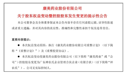 根据公司重整计划及重整投资协议的相关安排,广东神农氏拟以不超过54.19亿元的投资资金对康美药业进行投资,获得康美药业3,509,413,788股的转增股票,占康美药业实施资本公积金转增股票后总股本的25.3134%,为公司第一大股东且可实际支配的上市公司股份表决权足以对公司股东大会的决议产生重大影响,广东神农氏成为公司控股股东。