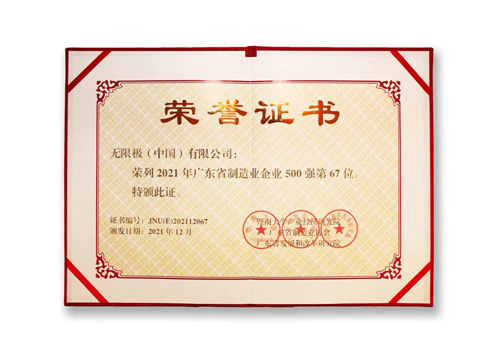 2021广东省制造业企业500强第67位并获证书