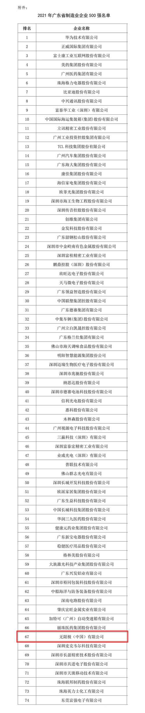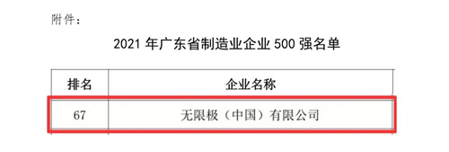 无限极荣列2021广东省制造业500强第67位