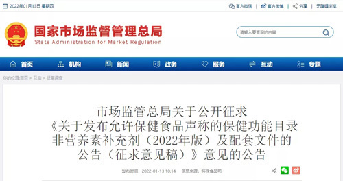 为进一步推进保健食品注册工作,根据《中华人民共和国食品安全法》《保健食品注册与备案管理办法》《保健食品原料目录和功能目录管理办法》,市场监管总局组织制定了《关于发布〈允许保健食品声称的保健功能目录 非营养素补充剂(2022年版)〉及配套文件的公告(征求意见稿)》,现面向社会公开征求意见,意见建议反馈截止时间为2022年2月12日。公众可以通过以下途径和方式提出意见建议: