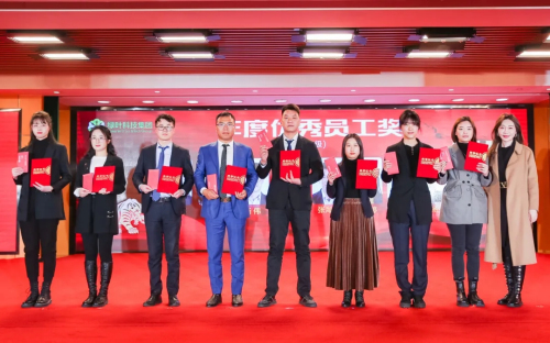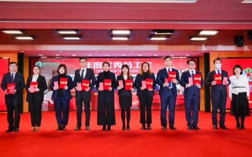 △ 绿叶科技集团高级副总裁韩静 为业务部刘广国、物流部卢红丽、采购部陈伟凤、采购部刘祥刚、市场管理部樊贞贞、电商部翁琳、核算部瞿鸿伟、IT部朱喜健、企划部于海生、合规管理部庄栋颁发“年度优秀员工奖”