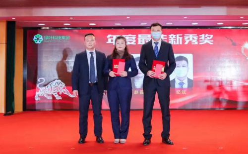△ 绿叶科技集团副总裁兼总厂长牛明辉 为营销部赵霞、合规管理部纪斌颁发“年度最佳新秀奖”