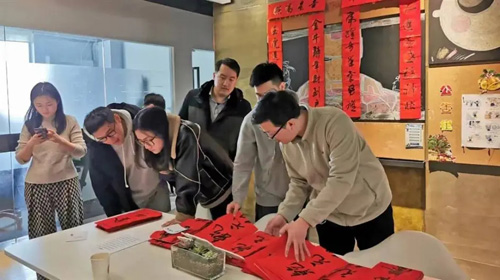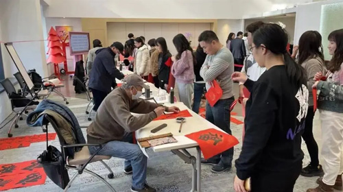 新春来临之际,静安区江宁路街道也在玫琳凯大厦举行“书千副春联,送千户人家”活动,本次活动采取了在线预约和入场限流措施,活动现场更是吸引了不少白领职工争相现艺,在新年的欢快音乐声中,书法家们泼墨挥毫,为有序排队的白领职工书写春联内容,现场满是浓浓的节日氛围。