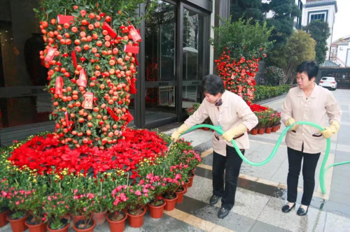 普宁总部保洁员对院子里的橘子树、盆栽进行养护