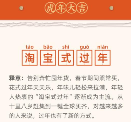 业内指出,“淘宝式过年”赋予了“年”新的内涵和味道,一方面,为消费者带来更多新鲜、别样的年味与欢乐,另一方面,新的服务模式也正在推动形成新的年俗文化,为提振春节消费、激发内需开启新的空间,增添新的活力。
