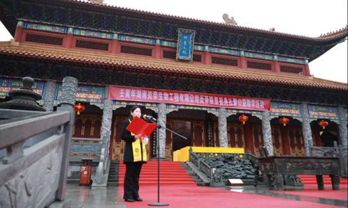 随后在黄佳林董事长带领下一行人向炎帝神农氏行礼并穿过午门前往后殿谒林参观,期间在行礼亭向炎农神氏敬香,参拜、参与烧钱塔仪式。一路上大家纷纷打卡留念,在感念中祈愿风调雨顺,事业更上一层楼,相信在始祖大爱的福泽下,炎帝生物在新的一年里也必将宏业大展,再创辉煌!