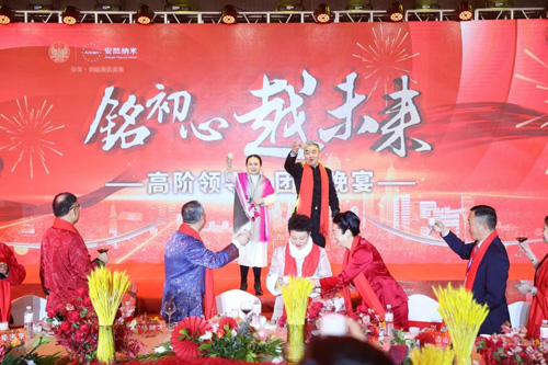一曲热情昂扬的开场舞后,晚宴正式拉开帷幕,两位大家长与公司高管共同为大家带来合唱曲目《大中国》。