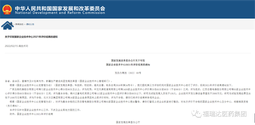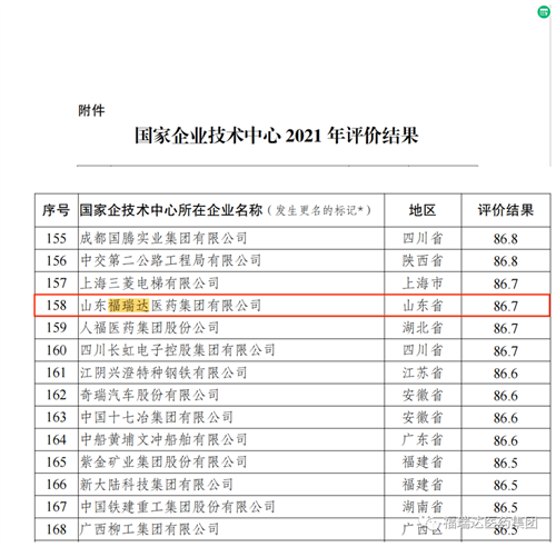 近日,国家发展改革委办公厅发布了国家企业技术中心2021年评价结果(发改办高技〔2022〕68号)。山东福瑞达医药集团有限公司技术中心位列全国1744家评价企业的第158名,获评良好等级(评分86.7分)。这一评价结果是对山东福瑞达医药集团有限公司企业技术中心创新能力的肯定。