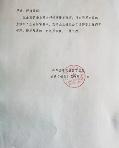 一是暂停直销企业各类会议的召开。省内直销企业及直销企业驻晋直销企业分支机构和在晋开展经营活动但无分支机构的直销企业,经销商(专卖店),所有会议暂停召开,(不论性质、规模、场地),各级市场监管部门暂停会议登记,如发现问题,按照"谁登记、谁负责"的原则,追究相关责任。