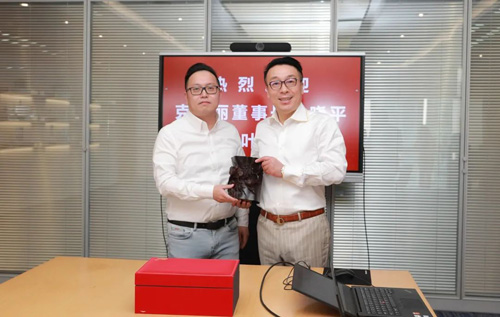 ▲徐晓平董事长向徐建成董事长赠送精美工艺品