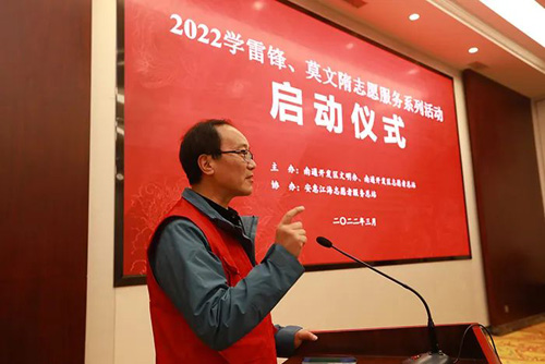 南通开发区江海志愿总站站长姚卫民介绍了开展本次活动的初衷和意义,并详细介绍并发布了十个志愿者服务项目。会上,“磨刀老人”吴锦泉也讲述了他是如何与莫文隋老人一起创建“莫文隋爱心基金会”的故事,他强调榜样的力量:做好事要一个带一个,做好事没有带头人,是没有办法做成的。