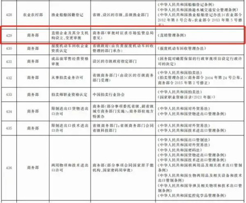 近日,国务院办公厅印发的《关于全面实行行政许可事项清单管理的通知》(以下简称《通知》),就可以回答这个问题。其中,商务部共有18项工作被列入清单当中,其中第429项是关于“直销企业及其分支机构设立、变更审批”的,这里明确指明,审批部门是商务部(审批时征求市场监管总局意见),依据是《直销管理条例》。
