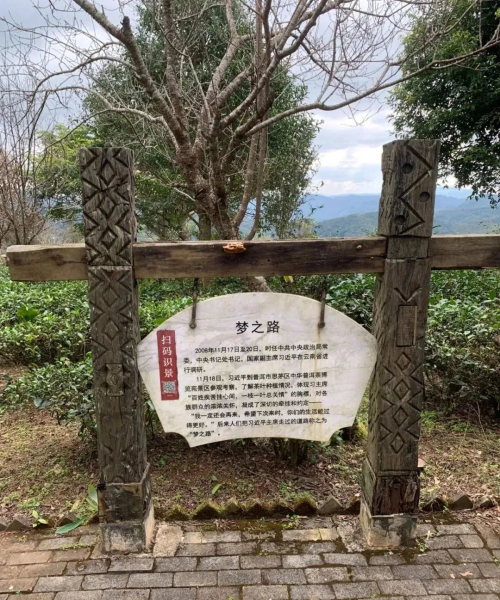 2008年11月17日至20日,时任中共中央政治局常委、中央书记处书记、国家副主席习近平在云南省进行调研。11月18日,习近平到普洱市思茅区中华普洱茶博览苑景区参观考察,了解茶叶种植情况,体现习主席“百姓疾苦挂心间,一枝一叶总关情”的胸襟,对各族群众的浓浓关怀,凝成了深切的牵挂和约定——“我一定还会再来,希望下次来时,你们的生活能过得更好”。后来人们把习近平主席走过的道路称之为“梦之路”。