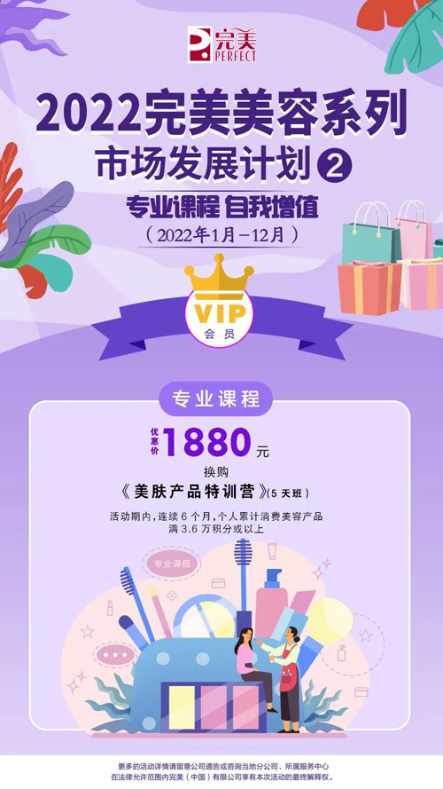 活动期内,连续6个月个人累计消费美容产品满3.6万积分或以上,即可以优惠价1,880元换购《美肤产品特训营》(5天班)名额一个。