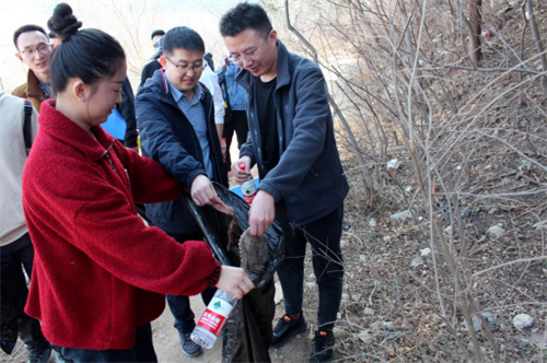 上午十时,员工们热情高涨,从藏龙涧脚下迈着欢快的步伐向山顶进发,大家一边欣赏着藏龙涧的无限春光,一边畅谈生活趣事,尽享登山乐趣。在本次登山活动中,大家手拿垃圾袋,随手捡起路边垃圾,为“绿水青山”贡献一份力量。