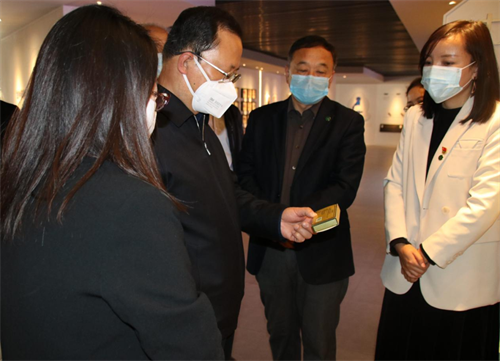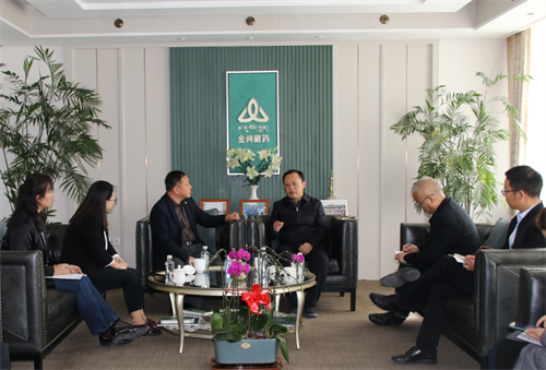 金峰主任一行通过观看金诃藏药品牌形象纪录片,参观展厅,详细了解了公司发展历程、品牌建设、产品体系及市场销售情况。牛豫娟总裁就金诃藏药“五位一体”发展模式、产品体系及销售模式等作了简要介绍。